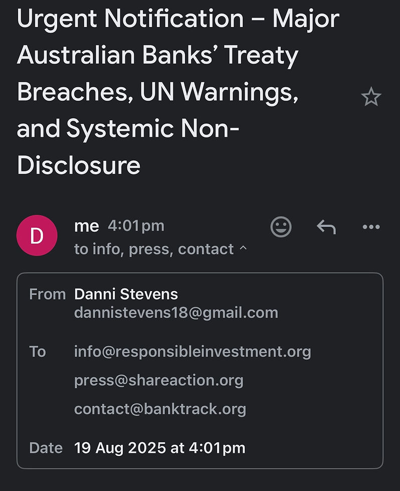 Subject: Urgent Notification – Major Australian Banks’ Treaty Breaches, UN Warnings, and Systemic Non-Disclosure