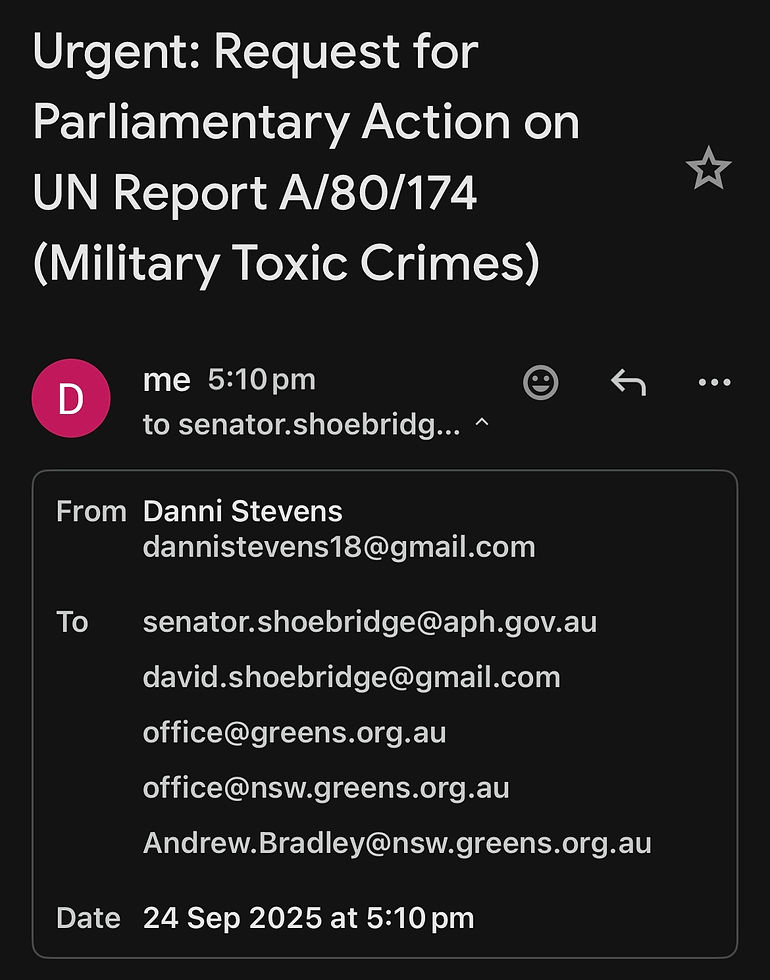 On 24/09/2025 I publicly served notice to the Permanent Representatives of Australia, New Zealand, Canada, the United States that they will sit at the United Nations General Assembly in October when Special Rapporteur Marcos Orellana presents Report A/80/174.