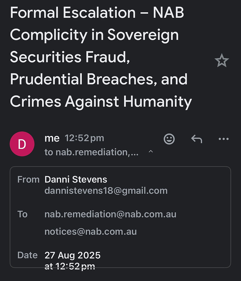 Subject: Formal Escalation – NAB Complicity in Sovereign Securities Fraud, Prudential Breaches, and Crimes Against Humanity