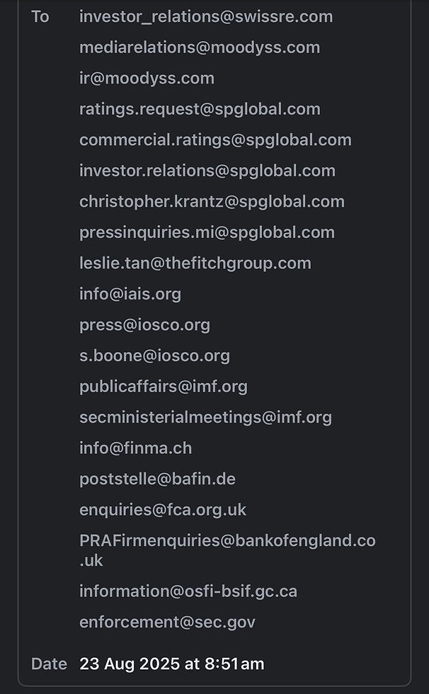 Regulatory breach – Failure to address this matter will now be documented with FINMA, BaFin, FCA/PRA, SEC, OSFI, IMF, BIS, FSB, IOSCO, and the OECD.